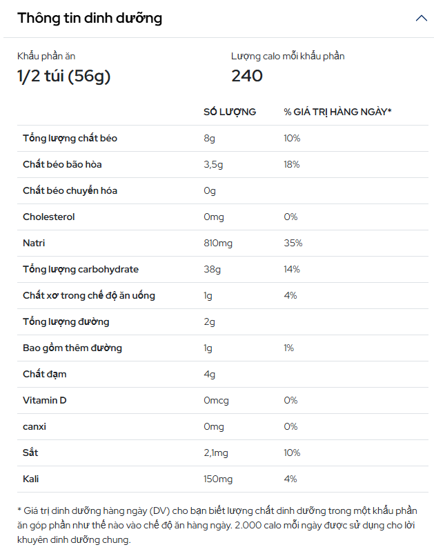 - Calories: khoảng 350 kcal/gói – vừa đủ cho một bữa ăn nhanh, tiện lợi