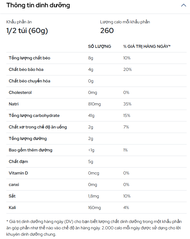 Thành phần dinh dưỡng trong mỗi gói mì: